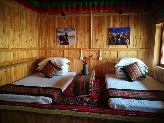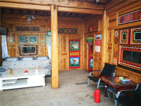 走進安果村村民貢保杰布的家中,記者看到了非常干凈的藏式風(fēng)格民宿包間。貢保杰布今年50歲,妻子貢去乎吉與他同齡,有兩個兒子:貢保熱旦、貢保杰,4人都在家務(wù)農(nóng)。他家中共有耕地8畝,草場面積350畝,家中有23頭編雌牛。2018年,貢保杰布將自己的庭院打造成鄉(xiāng)村民宿,在旅游旺季,按照每間客房300元的收費標(biāo)準,一年接待游客收入達到5000元左右。